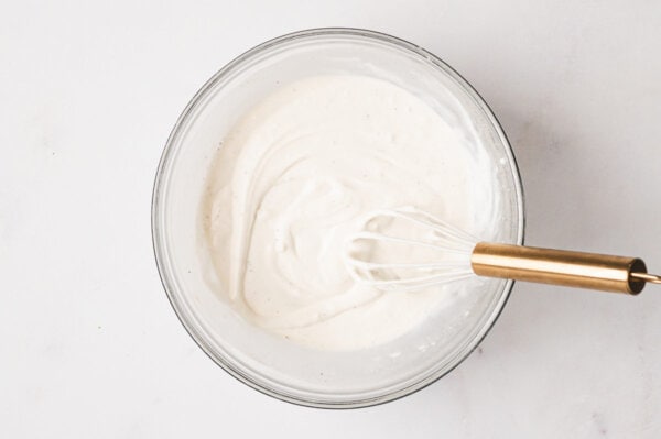- In another bowl make the dressing. Whisk together 1/2 cup each mayonnaise and sour cream, 2 tablespoons apple cider vinegar, 1 tablespoon sugar, 1/4 teaspoon coarse salt, and some fresh cracked pepper to taste