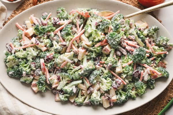 Classic broccoli salad gets a delicious twist in this Broccoli Apple Salad recipe. Honey crisp apples are tossed in a creamy dressing, alongside broccoli, carrots, cranberries, and pecans. I love the blend of sweet, savory, and tangy flavors as well as all the crisp, crunchy ingredients. Perfect summer eating!