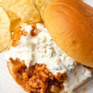 These Buffalo chicken sloppy joes are my latest variation, and I love them! Ground beef is swapped for ground chicken, and the sauce is simplified, made with tomato sauce, brown sugar, and Buffalo sauce. You still get some of the classic flavors, but the focus is definitely on the Buffalo sauce here, so it has a slight kick. If you want the mixture spicier, you can add red pepper flakes.