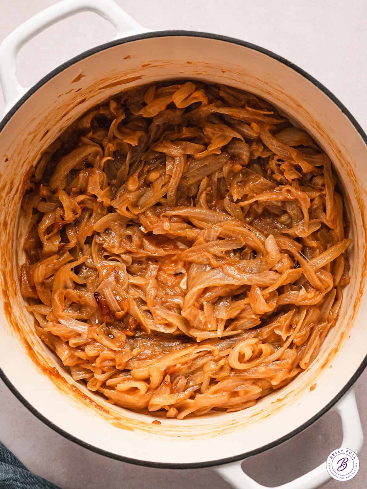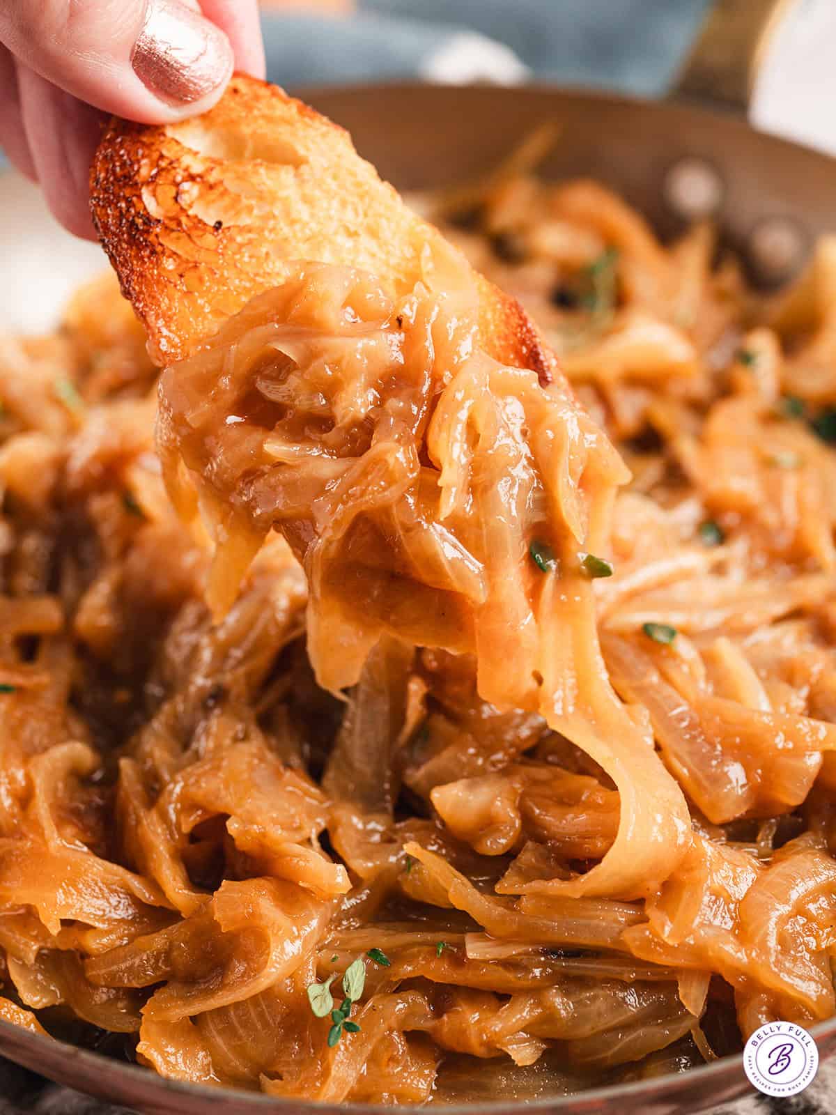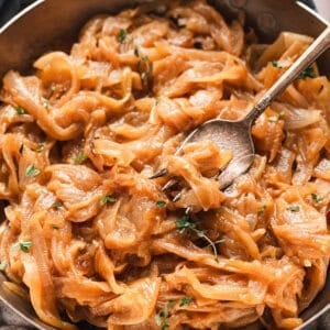 I love adding these caramelized onions to so many things. Caramelized onion dip is a fun twist on classic French onion dip and they’re fantastic stirred into mac and cheese to make French onion mac and cheese. They’re perfect on a burger (like my Juicy Lucy burgers) and are a great way to add flavor to grilled cheese. I’ve also served them with crostini as an appetizer. Half of the time I just eat them by the forkful!