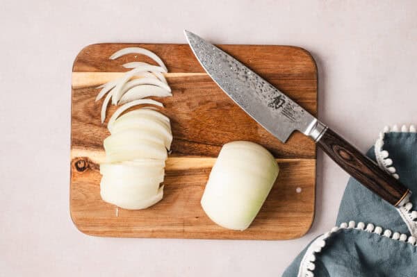 - Use a mandolin. While you can definitely slice the onions by hand, I like to use a mandolin. It ensures thin, even slices with less work.