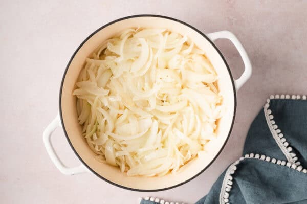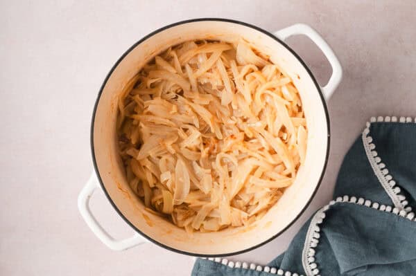 - In a large pot over medium-high heat, melt the butter. Add in the onions and sauté, stirring often until softened, about 10 minutes, scraping up and mixing in any browned onions from the bottom of the pan.