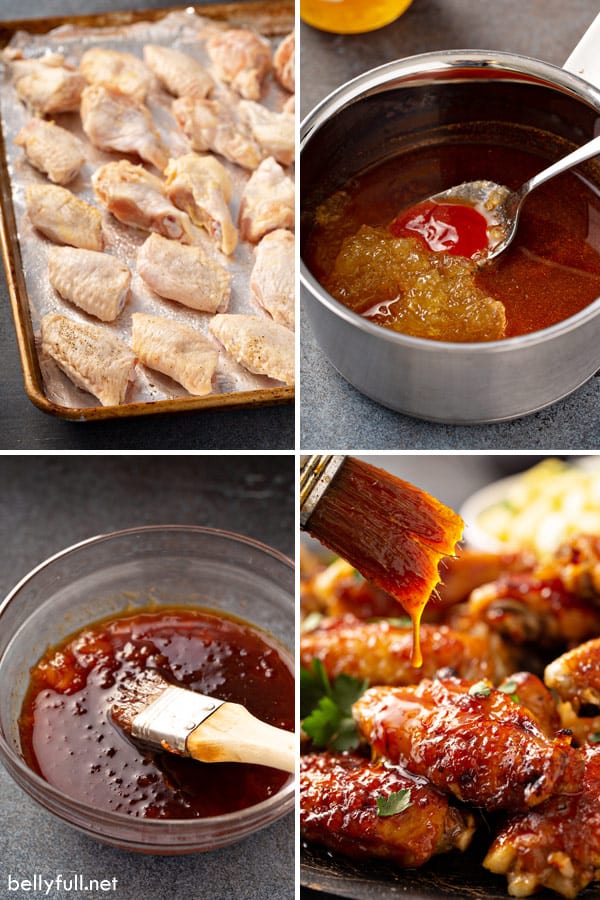 This recipe starts with chicken wings which are seasoned with a little salt and pepper. The wings go onto a baking sheet in a single layer, then are baked at high heat. While they bake, you’ll make the jerk-pineapple glaze, which gets basted on the wings in 10 minute intervals until the chicken is cooked through. The chicken skin gets caramelized in the oven and are completely irresistible.