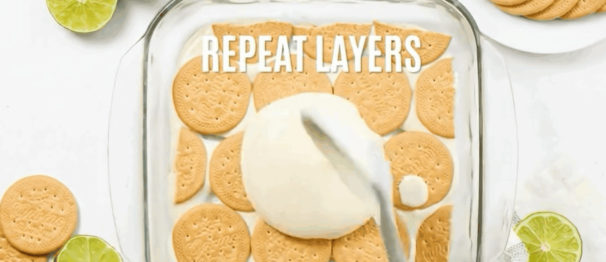 - Continue layering until there are no more ingredients left, ending with a smooth layer of the creamy lime mixture on top. (You should end up with 3 layers of cookies.) Give the dish a gentle tap on the counter to help remove any air bubbles and make sure the cream mixture surrounds all the cookies.