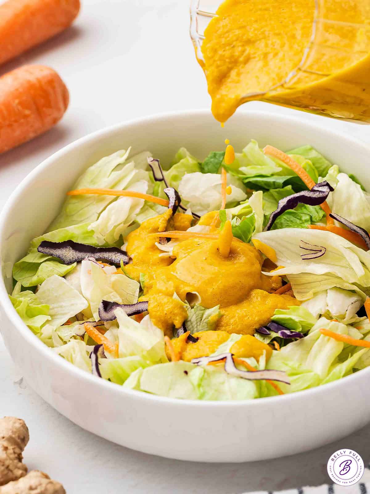 At a Japanese restaurant, they typically serve this dressing over a side salad made with chopped iceberg lettuce, thinly sliced red cabbage, and julienned carrots. It’ll work over nearly any side salad, though! To make it into a full meal, make a bigger salad and add a protein like grilled chicken.