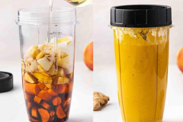 - Place the chopped carrots, onion, apple, ginger, 1/2 cup neutral oil, 1/2 cup rice vinegar, 1/4 cup low sodium soy sauce, 1 teaspoon sesame oil, 1 & 1/2 tablespoons honey, and a pinch of salt and pepper in a food processor or a high powdered blender and pulse until smooth.