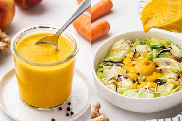 This carrot ginger dressing recipe is based on the dressing served at Japanese restaurants, with so much depth of flavor. It has that zesty, earthy bite from the ginger, the mild taste and orange color from the carrots, and sweetness from the apple and honey. It’s super smooth and creamy too, perfect for drizzling over a variety of salad and grain bowls. I love to keep a jar of this in the fridge and bring my salads to life throughout the week!