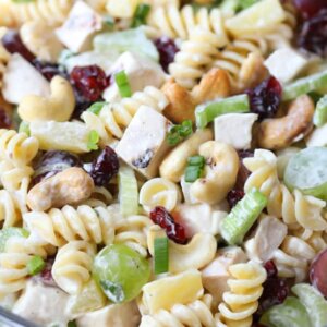 I’ve brought this pasta salad to so many get togethers and I always leave with an empty bowl – everyone loves it! With spiral pasta, cooked chicken, fresh fruit, salty crunchy cashews, and a creamy dressing, it’s loaded with texture and flavor. Sort of reminds me of a cross between my broccoli salad and chicken salad. Sweet and savory combos are always the best!