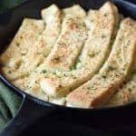 Easy homemade Cheesy Breadsticks with butter, garlic, herbs, and stuffed with mozzarella. Then sprinkled with parmesan and baked in a cast iron skillet! Great with soup, dipped in marinara, or all on their own.