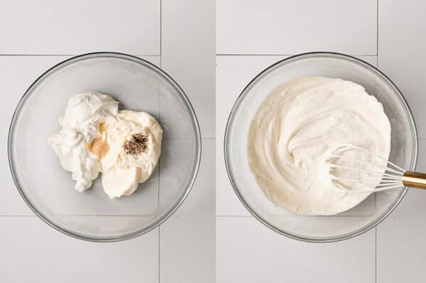- In a medium bowl, whisk together sour cream, mayonnaise, garlic powder, and black pepper until combined.