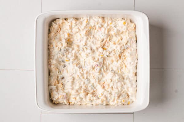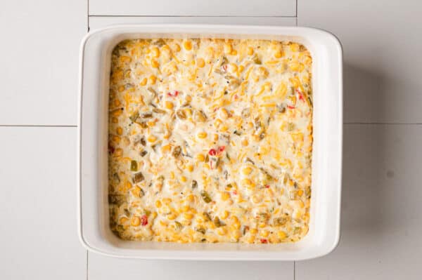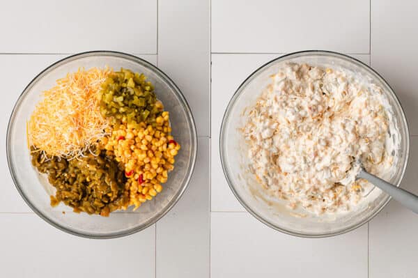 - Add in chopped pickled Jalapeño peppers, drained diced chiles, drained sweet corn & diced peppers, and shredded Mexican blend cheese; stir to combine until incorporated.