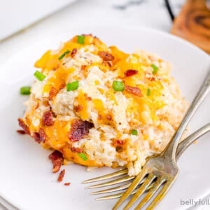 This cheesy potatoes casserole is the epitome of cozy comfort food. This dish and similar variations are also known as funeral potatoes because they’re so often served after funerals, especially in the Midwest. You may also see them described as party potatoes because they’re just as often served up as a cheesy side dish at parties, and crack potatoes referring to their addictiveness!