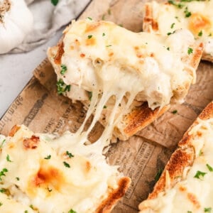 This Chicken Alfredo French Bread Pizza is such a delicious mash-up on two classic recipes. It’s made with an easy homemade alfredo sauce, rotisserie chicken, and lots of cheese piled on toasty French bread halves. This works as an appetizer on game day with friends and also makes an easy weeknight dinner the entire family will love.