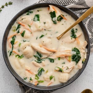 To keep things simple and easy, I like to serve this chicken gnocchi with a basic side salad or Caesar salad and bread. My no-knead Dutch oven bread is always my go-to for soaking up every bite of soup but breadsticks are a good option too.