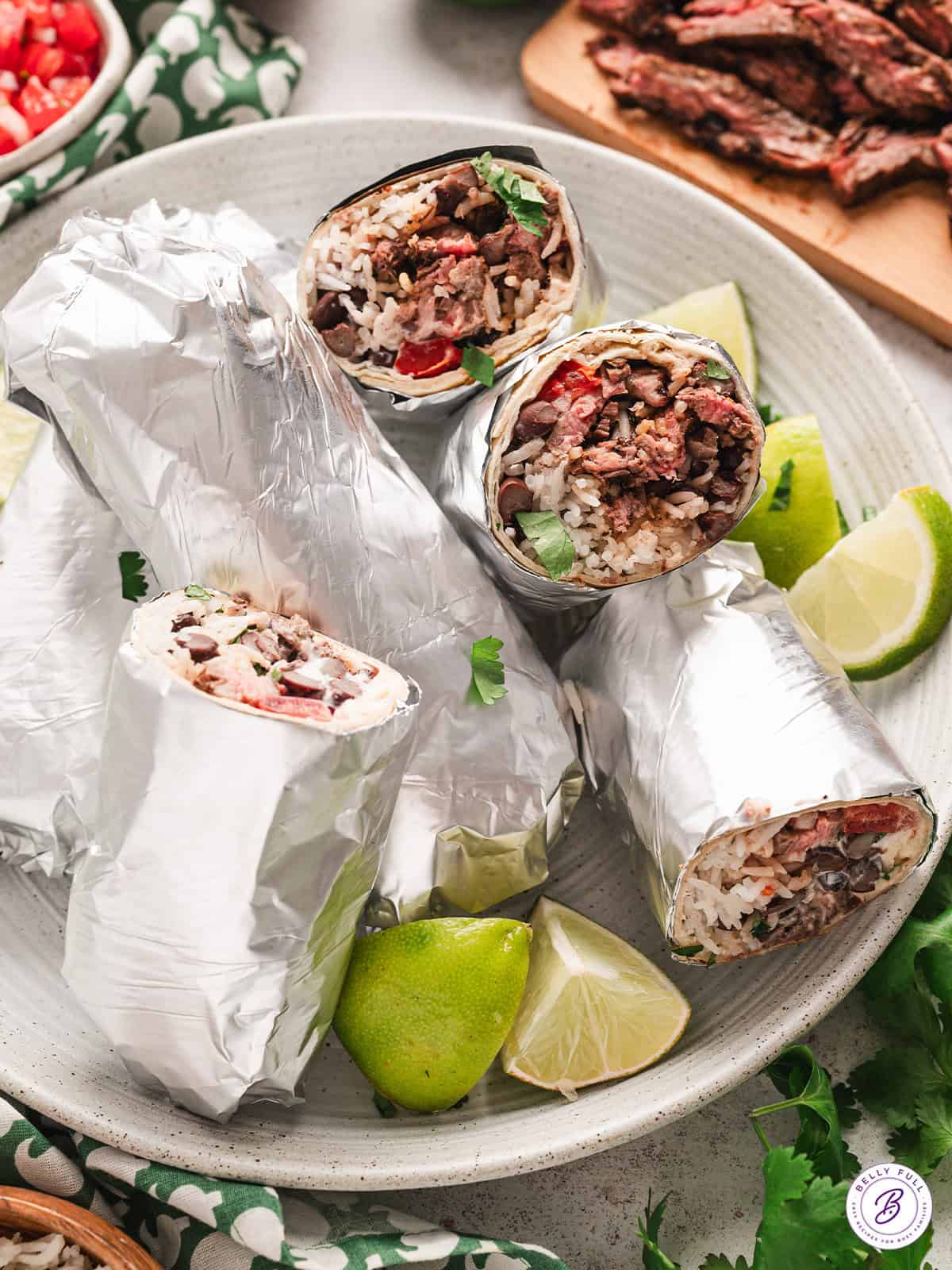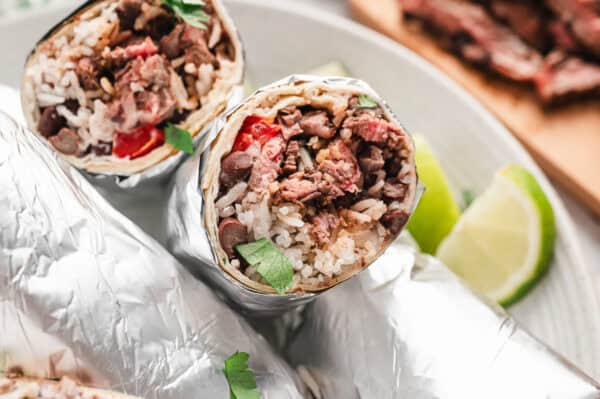 This Copycat Chipotle Steak Burrito recipe is just like you’d get at the restaurant chain but made at home, including perfectly seasoned grilled steak, cilantro-lime rice, beans, pico de gallo, and sour cream.