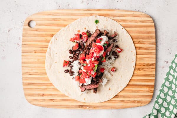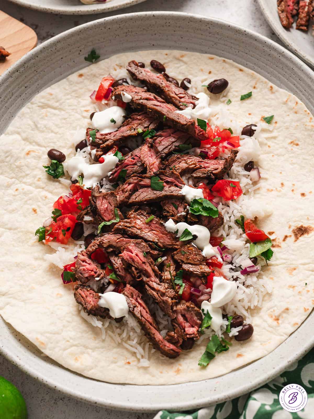 - Warm the flour tortillas over a gas burner or in the microwave for about 15 seconds. Place on a flat surface, evenly distribute the rice, then steak, topped with the black beans, the pico de gallo, and sour cream.