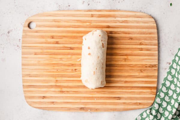 - Fold the flap nearest you over the filling, then fold in the sides; roll burrito away from you, keeping it tight to form a log. Rest, seam side down.
