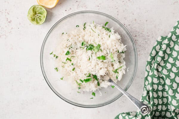 - For the rice: Drizzle the lime juice, lemon juice, and oil over the top of the warm cooked rice, then sprinkle with the chopped cilantro and salt; fluff with a fork.