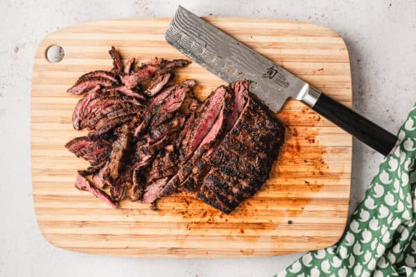 - Heat a grill to medium-high. Coat grill grates with oil or nonstick spray. Cook steak for about 4 minutes per side, or to your liking. Transfer to a cutting board and let rest for 5 minutes. Slice thinly against the grain.