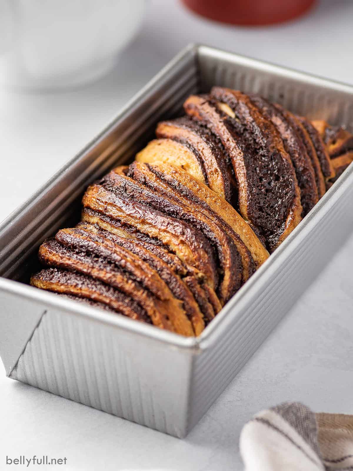 - Don’t cool completely in the pan. Once you add the syrup to the babka, it should cool for just 10 minutes in the pan. Then transfer it to a cooling rack. If you leave it in the pan, it will likely stick due to the syrup.