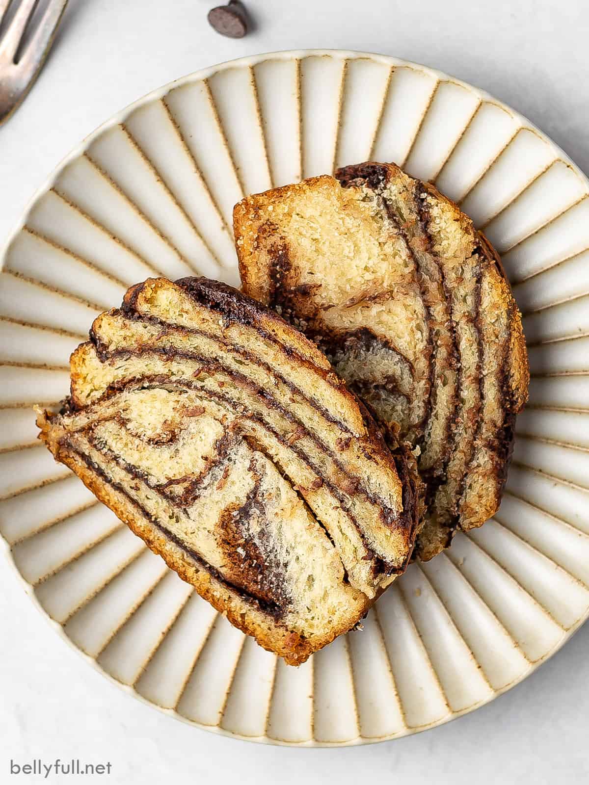 - Allow to cool before cutting. As tempting as it is to slice it immediately, allow the chocolate babka to cool to just about room temperature before slicing. Otherwise, the filling won’t set properly and it will make a mess.