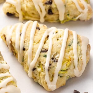 These Chocolate Chip Zucchini Scones are tender, flaky, and delicious with mini chocolate chips and fresh zucchini speckled throughout! Perfect for breakfast or brunch, or even a light dessert and a great use of summer garden zucchini or enjoyed all year round.