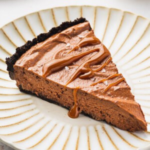 This homemade Chocolate Mousse Pie recipe is no bake and so easy. It has a cookie crust and a silky chocolate filling that’s sprinkled with sea salt and drizzled with caramel. Truly sublime!
