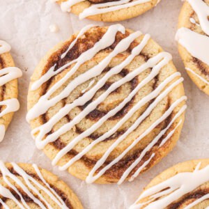 If you love classic cinnamon rolls, you’ll definitely love these cinnamon roll cookies! They take the important parts of cinnamon rolls – aka the cinnamon-sugar filling and the icing – and add it to a sugar cookie base. It’s the best of both worlds.