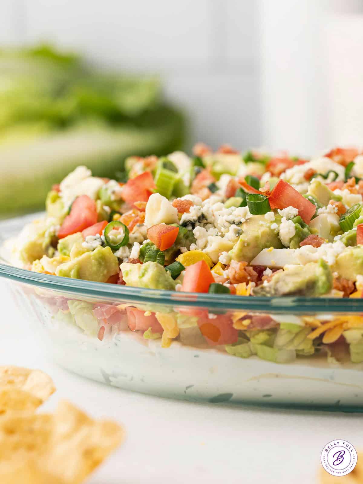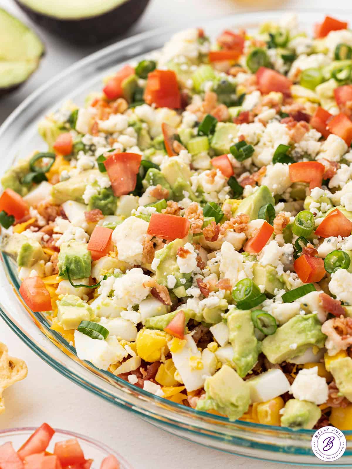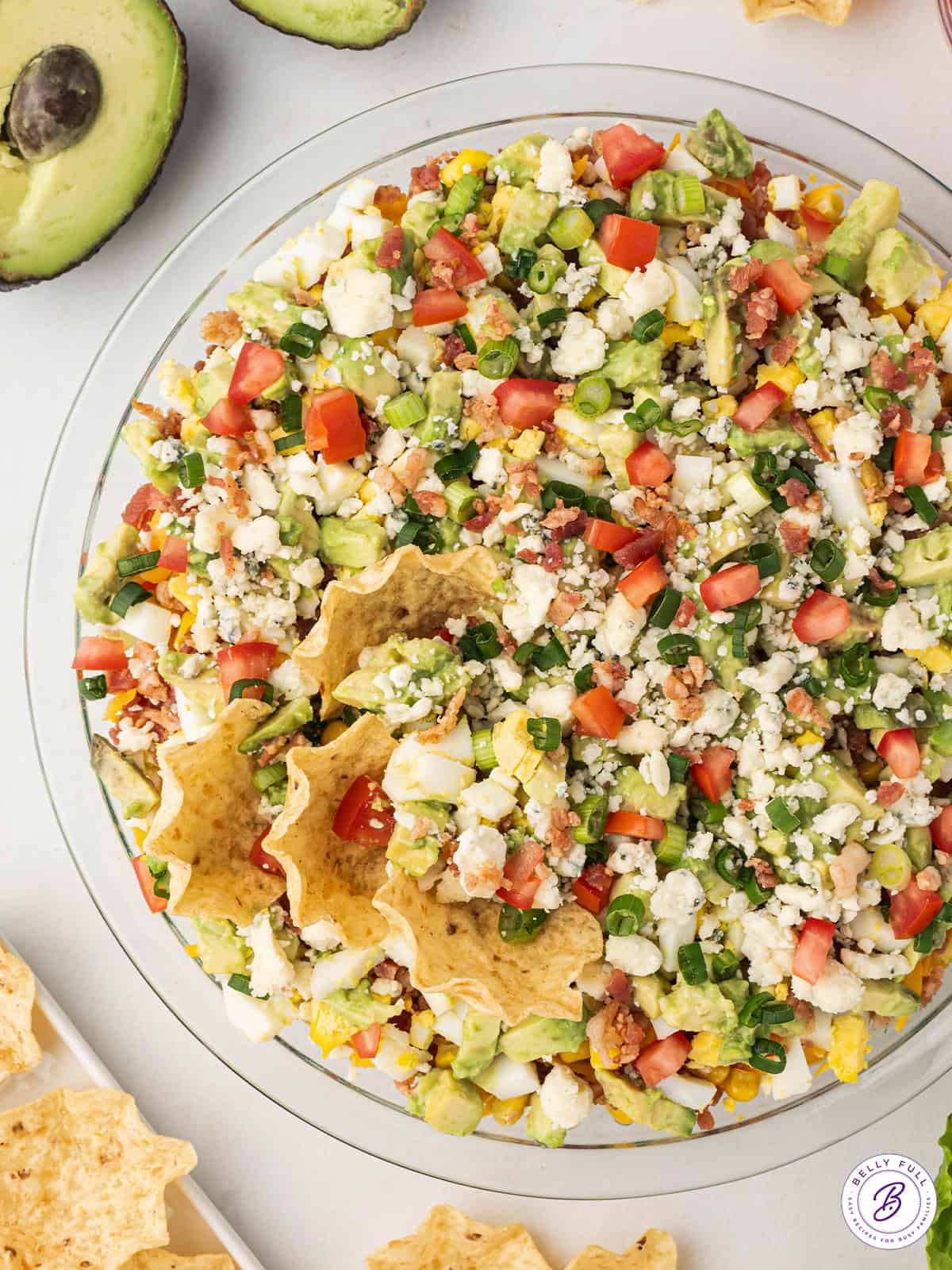 I typically serve this Cobb salad dip with tortilla scoops, pretzel flats, and/or crackers. Crostini is another great option. Since there are so many toppings, it’s important to pick dippers that are sturdy and won’t break easily.