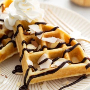 These easy homemade dessert waffles have a coconut flair and are taken to a sweet level with coconut milk, sweet coconut flakes, almonds, chocolate sauce, and whipped cream!