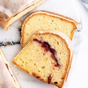 This Cranberry Orange Pound Cake is rich and buttery, with a layer of cranberry sauce inside, and a bright orange glaze. Perfect flavor combination and festive for the holidays!