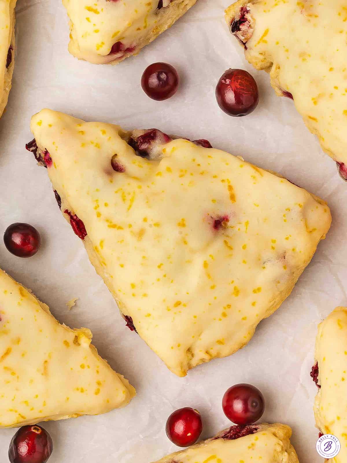 With fresh tart cranberries, orange zest throughout, and a sweet silky citrus glaze on top, these Cranberry Orange Scones are tender flaky pastries. They’re very easy to make using pantry items and way better than anything you’ll get at a coffee shop. I love to enjoy them for breakfast, brunch, or afternoon tea, and especially for Christmas morning!