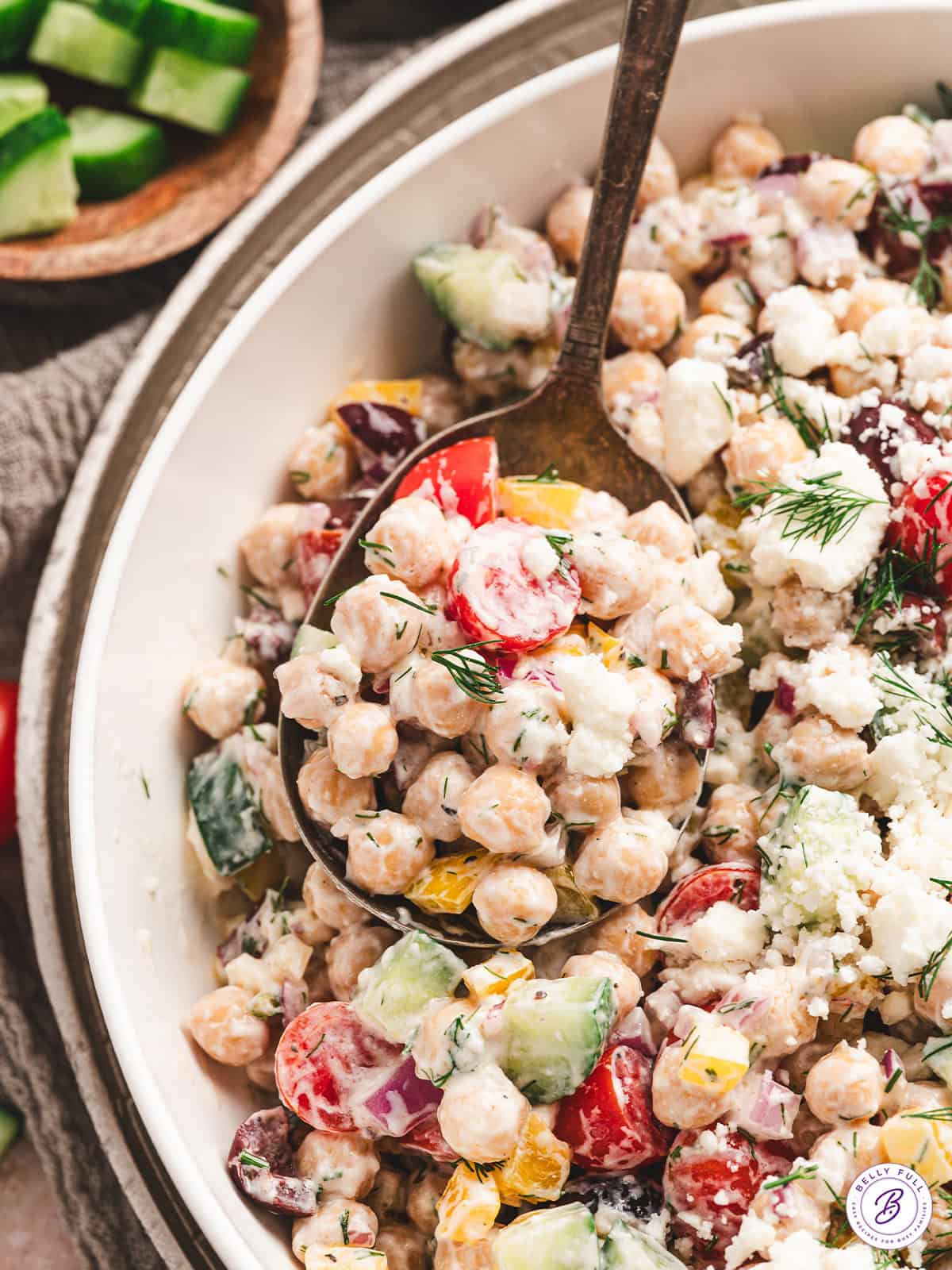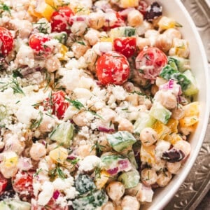 This Creamy Mediterranean Chickpea Salad is loaded with fresh veggies, chickpeas, and herbs tossed in a Greek yogurt dressing. It’s filling but light and makes a great lunch on a hot summer day or a side salad.