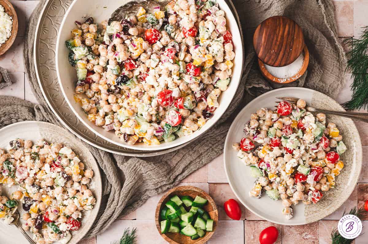 One thing I love about the creamy Mediterranean chickpea salad is that it’s hearty and filling enough to work as lunch or even dinner, but light enough to be a side salad too!