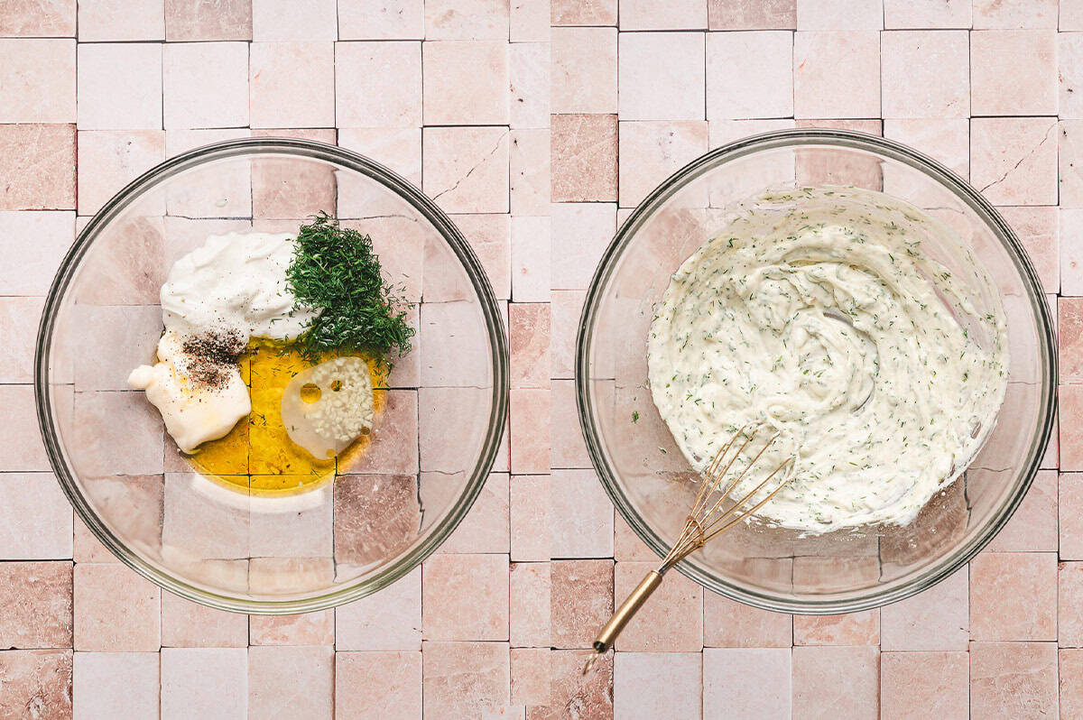 - Make the dressing. In a large mixing bowl, add 1/3 cup plain Greek yogurt, 2 tablespoons mayonnaise, 3 tablespoons olive oil, 3 tablespoons finely chopped fresh dill, 1 tablespoon fresh lemon juice, 1 small finely diced garlic clove, 1/2 teaspoon coarse salt, few grinds of fresh ground black pepper, and a pinch of red pepper flakes. Whisk together until incorporated and smooth.