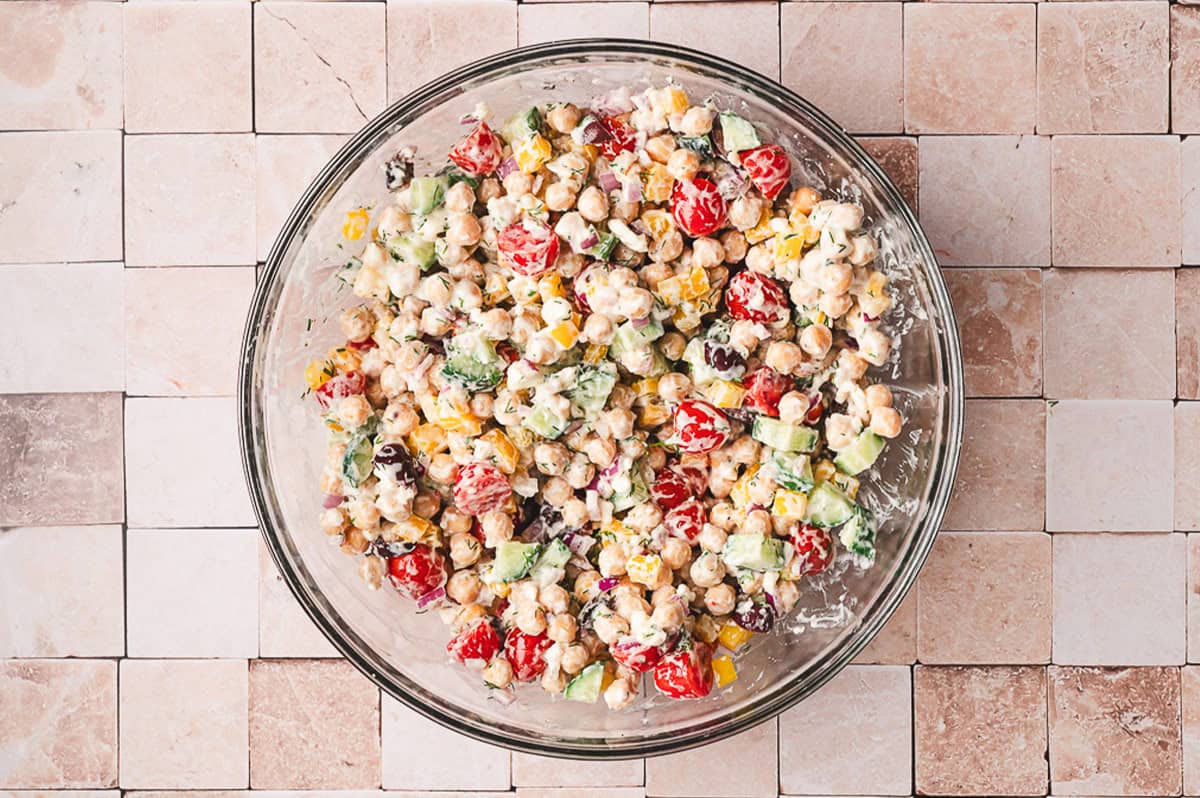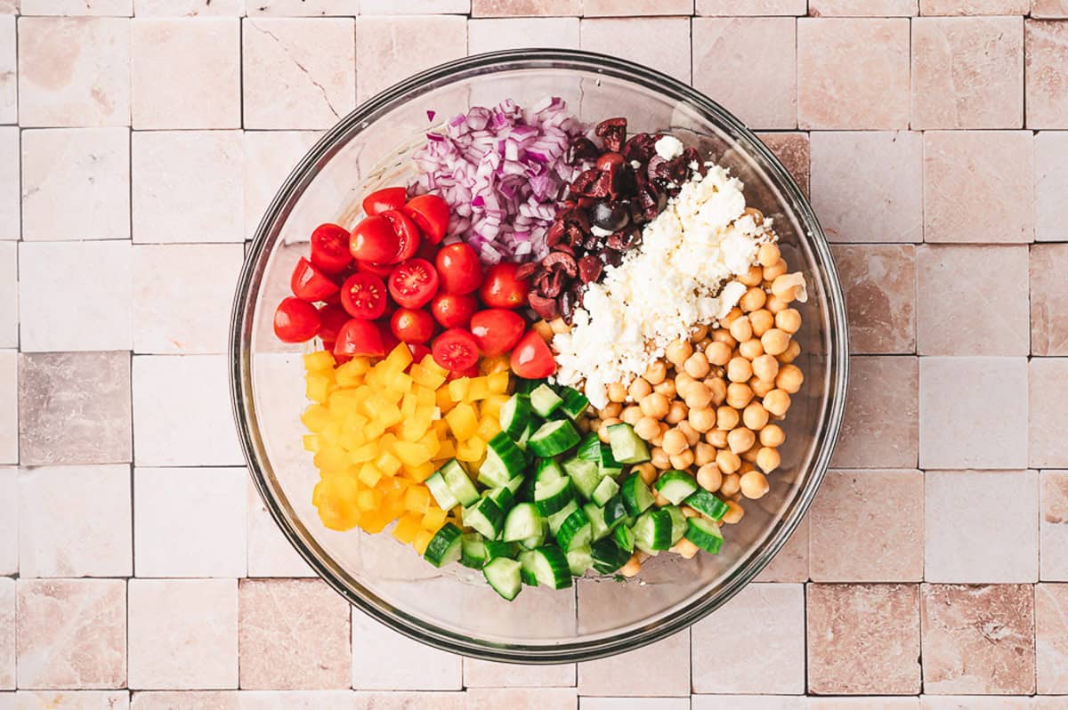 - Make the salad. Add to the bowl 2 cans of drained and rinsed chickpeas, 1 small diced yellow bell pepper, 1 small diced Persian cucumber, 1/2 a small diced red onion, 1 cup halved cherry tomatoes, 3/4 cup crumbled feta cheese, 1/4 cup chopped Kalamata olives, and 1/2 teaspoon coarse salt.