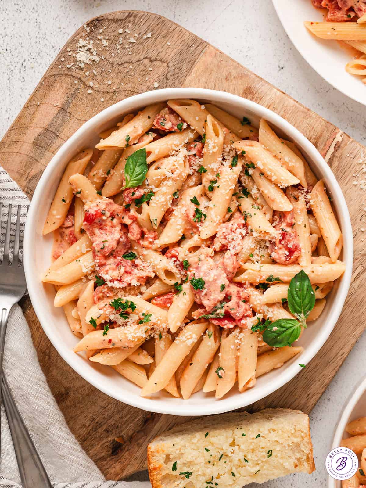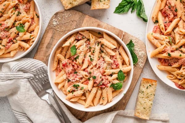 Creamy penne with tomatoes is such a simple weeknight dinner. I love to garnish the bowls with some fresh parsley and then pass some additional freshly grated parmesan at the table. For sides, some garlic bread or breadsticks are all you need! I’ll also whip up a simple side salad or caesar salad to go with it sometimes as well.