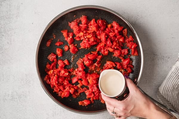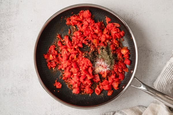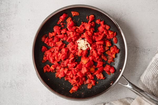 - In the meantime, in a large nonstick saucepan over medium heat, warm 1/3 cup olive oil. Add a 28 ounce can of diced tomatoes including its liquid and simmer for 3-4 minutes. Add in 3 cloves minced garlic and cook until fragrant, 20 seconds.