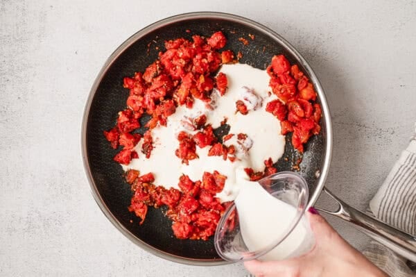 - Reduce the heat to medium again, then add 1/2 cup heavy cream. Stir to combine and simmer at a gentle bubble for about 2 minutes to thicken.