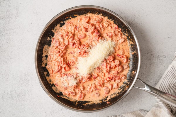 - Stir 1/4 cup grated parmesan cheese until melted and incorporated.