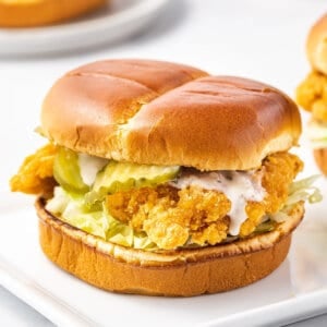But more times than not, I just make chicken sandwiches at home. Instead of deep frying the chicken, though, I cheat and bake up (or air fry!) some packaged frozen crispy chicken strips. And guess what? These crispy chicken sandwiches (along with beef and broccoli ramen, chicken pot pie noodles, and chicken alfredo) are seriously one of my familyโs favorite easy meals, either for lunch or dinner. I make them all the time – they’re SO easy!