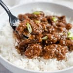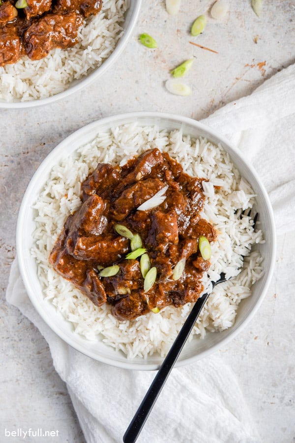 Mongolian beef is essentially a stir fry dish that’s very popular in Chinese-American restaurants. It consists of thinly sliced tender beef (typically flank steak) in a savory-sweet sauce that includes soy sauce, brown sugar, and aromatics, then served over cooked white rice or cellophane noodles. Today we’re sharing a variation on this classic made in a crockpot.