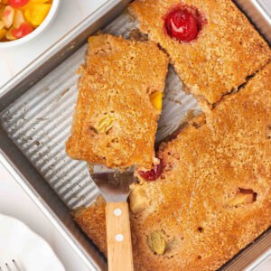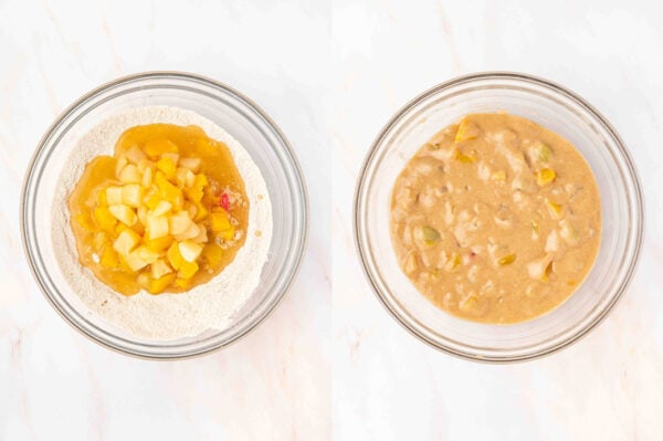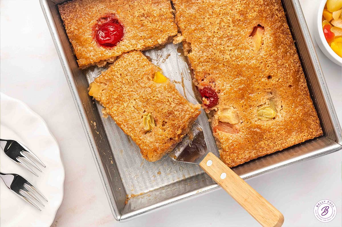 - Don’t drain the fruit cocktail. Just dump it in, juice and all! It’s the only liquid added to the cake and creates the moist texture.