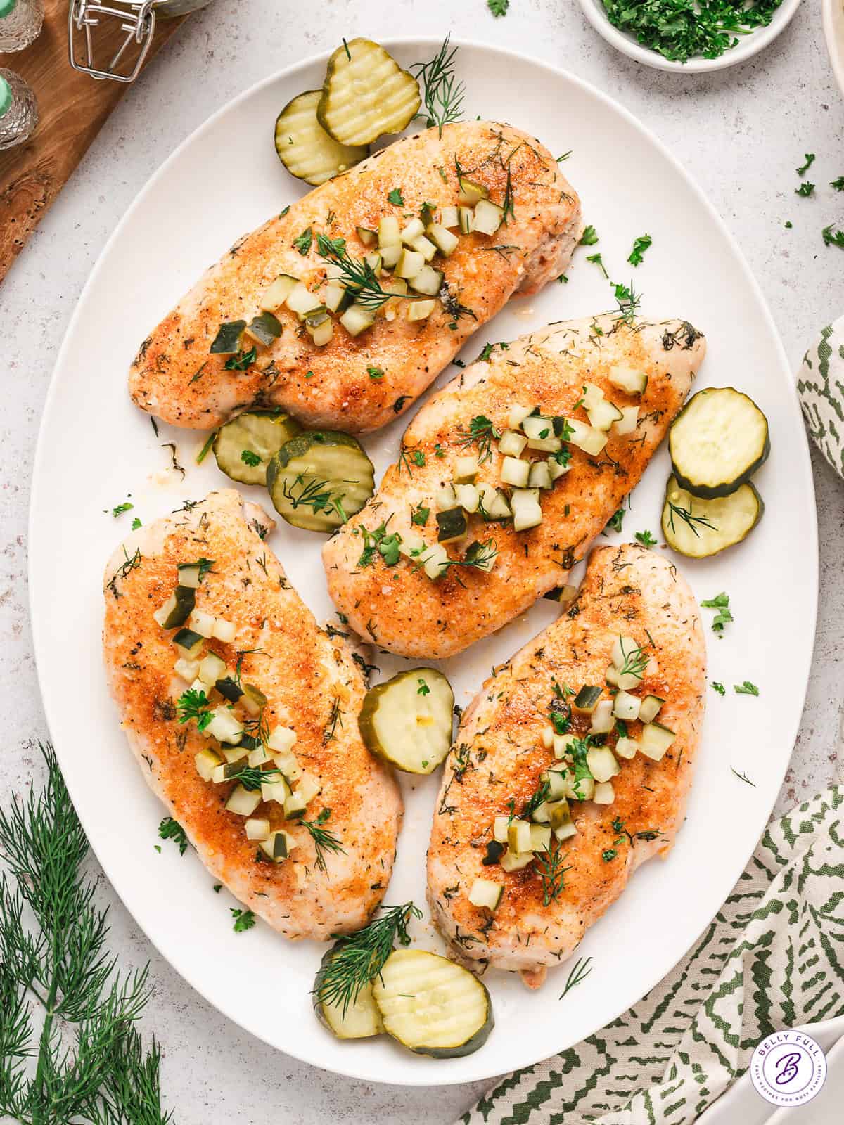 I like to serve this chicken with roasted vegetables, like roasted green beans or roasted radishes, and rice pilaf. Mashed potatoes or smashed potatoes would also be a great side. I also love to repurpose leftover dill pickle chicken by adding it to salads and wraps the next day. It’s such an easy way to add extra flavor!