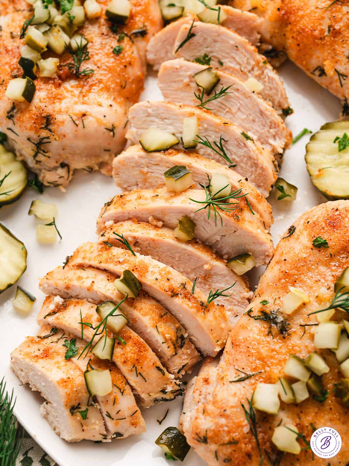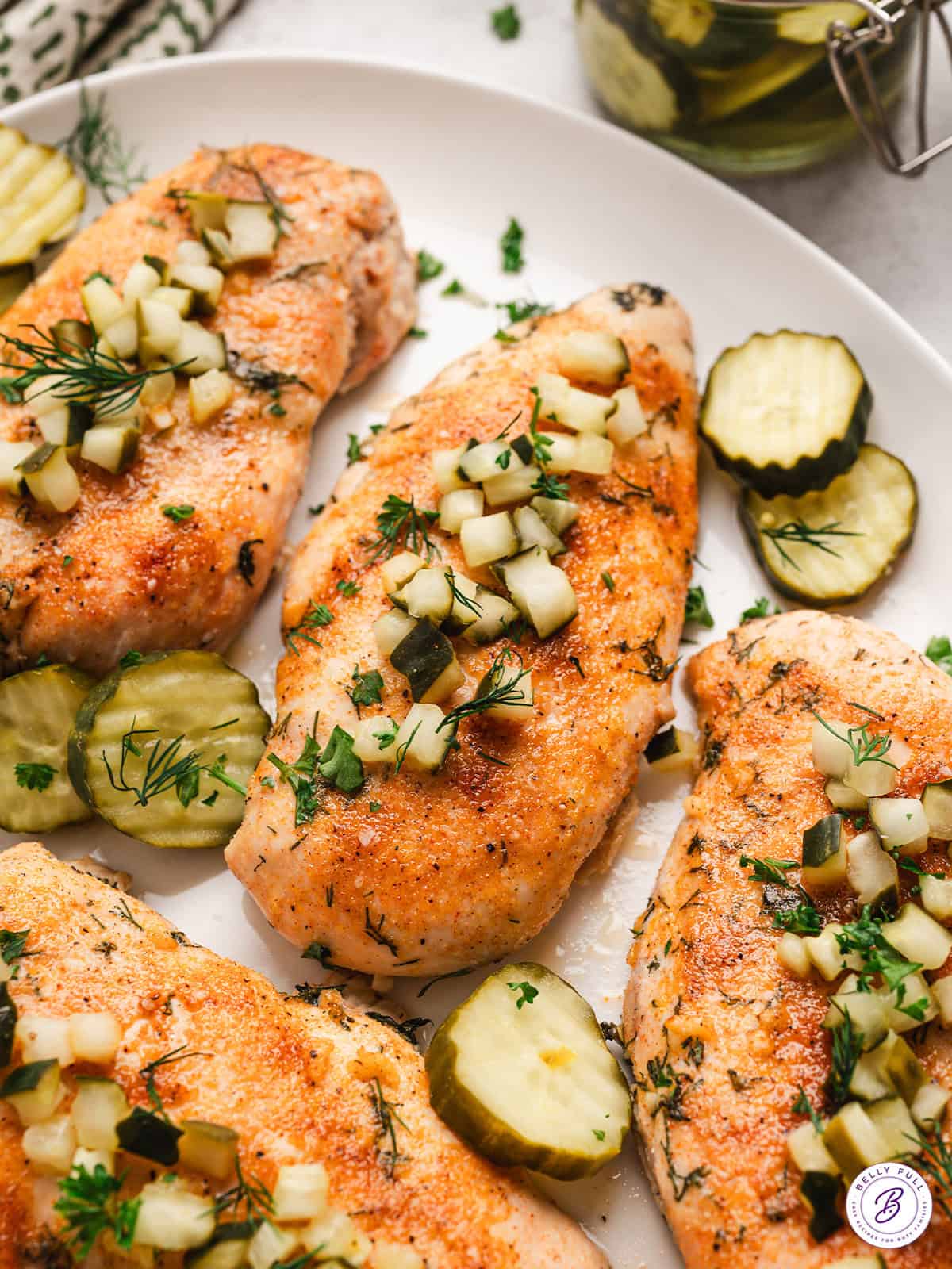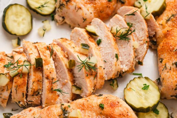This Dill Pickle Chicken is tender, juicy, and perfectly seasoned. The pickle juice not only adds great pickle flavor but helps to tenderize the chicken, too. It’s super easy to make and a must for pickle lovers like me!