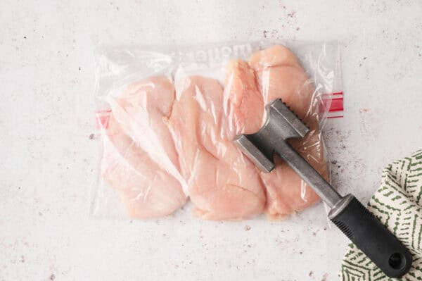 - Pound the chicken. It’s important to pound out the chicken breasts to and equal thickness. This helps ensure that the marinade infuses every bit of the chicken and makes for faster, even cooking.
