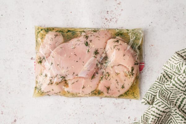 - Place chicken, 1 & 1/2 cups dill pickle juice, 1 tablespoon brown sugar, 1 clove minced garlic, and chopped dill in a resealable Ziploc bag. Remove as much air as possible and move the chicken around to coat. Transfer to the fridge for at least 3 hours (but no longer than overnight) to marinate.