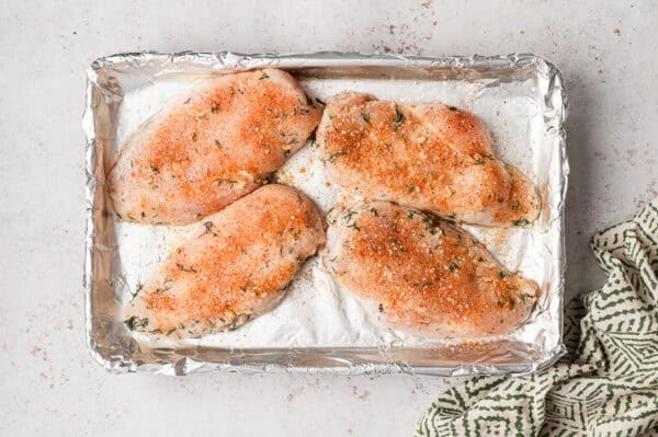 - Place chicken on the foil; drizzle with the olive oil and massage into the chicken on both sides. Sprinkle with the seasoning mix, on both sides, coating as much surface area as possible.