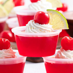 We do garnish these Dirty Shirley Jello Shots, but wait until right before serving so the whipped cream doesn’t melt and the fruit stays fresh. When you’re ready to enjoy them, run a dull knife around the inside edge of the container to loosen the jello and remove it. We also recommend giving your guests tasting spoons for those who don’t want to swallow them all at once.