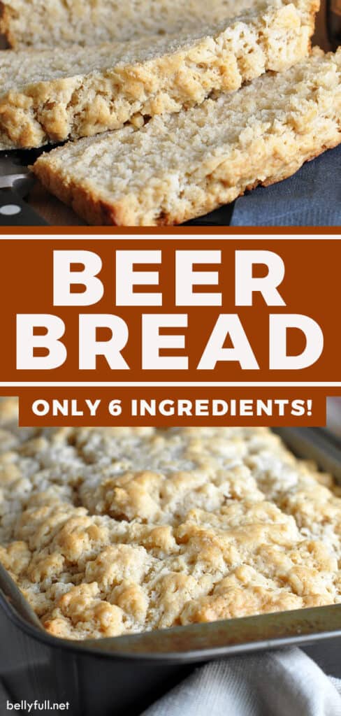 This Beer Bread Recipe is super easy to make with only 6 ingredients and a crispy buttery crust when it’s done baking. I love it on its own with a slab of butter or dipped into soup or chili!